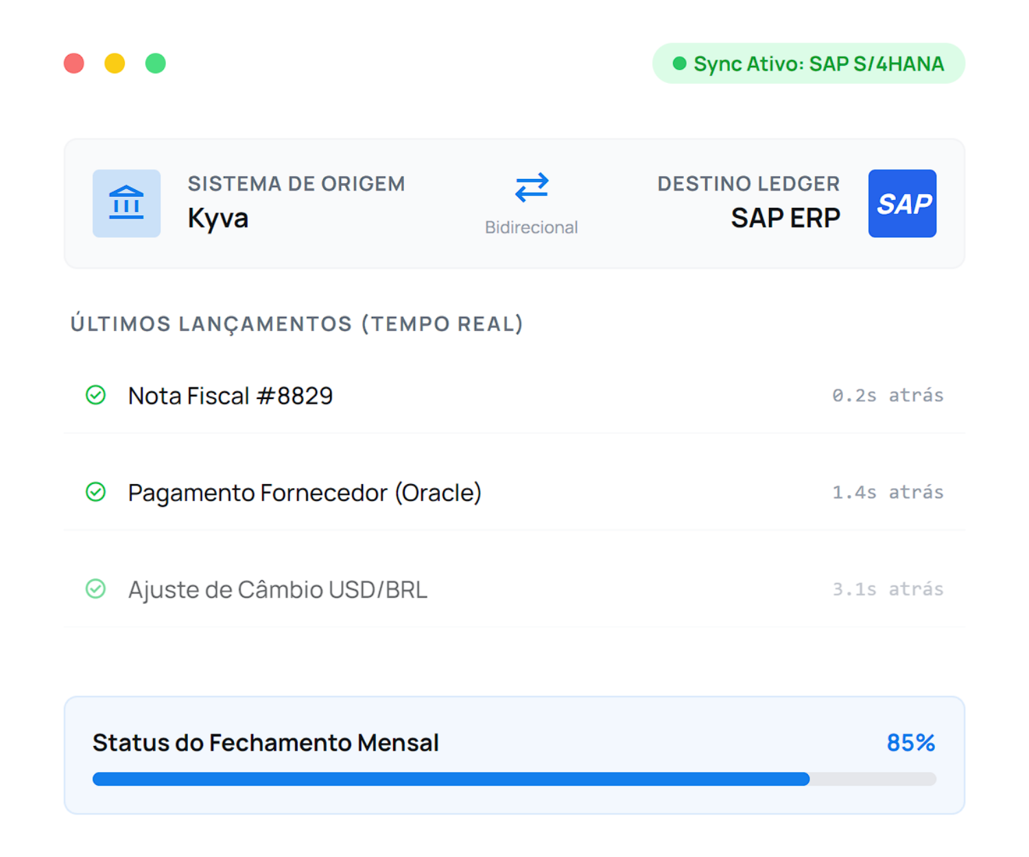 Elimine a digitação manual e o retrabalho contábil. O Kyva centraliza toda a sua operação financeira, valida cada centavo na origem e envia lançamentos prontos para o seu ERP. Menos tempo conciliando, mais tempo estrategizando