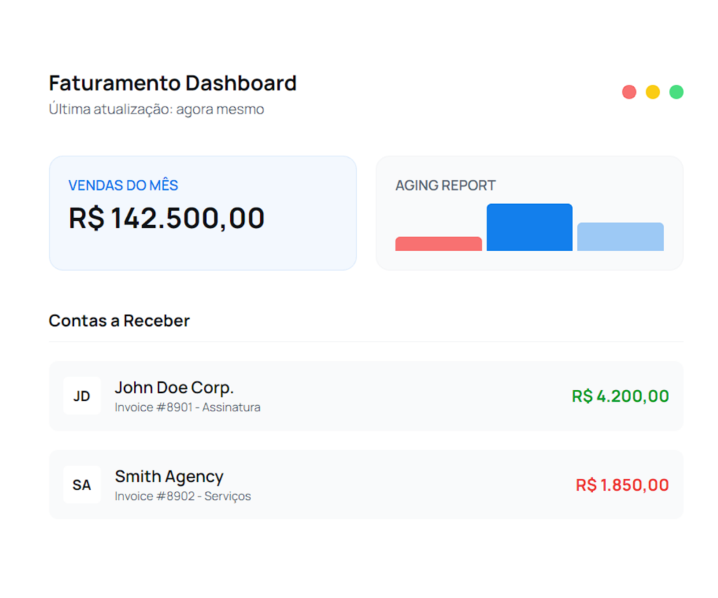 Cancelou uma fatura? O Kyva ajusta automaticamente o status dos recebíveis pendentes, evitando que dados falsos inflem seus relatórios de receita.